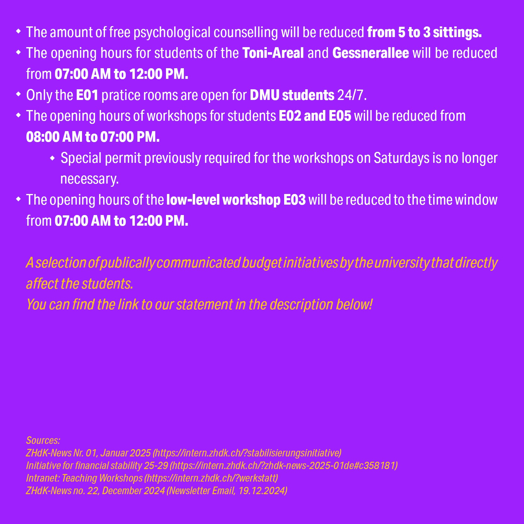 In the VERSO newsletter from December 2024, we had already informed about the planned night closure, only to find out a few days later that it was once again not mentioned in the ZHdK newsletter from December 19. Among the savings measures affecting students, only the reduction of psychological counseling hours was mentioned. However, this was extremely vaguely formulated and hidden as a sub-point in a separate section.