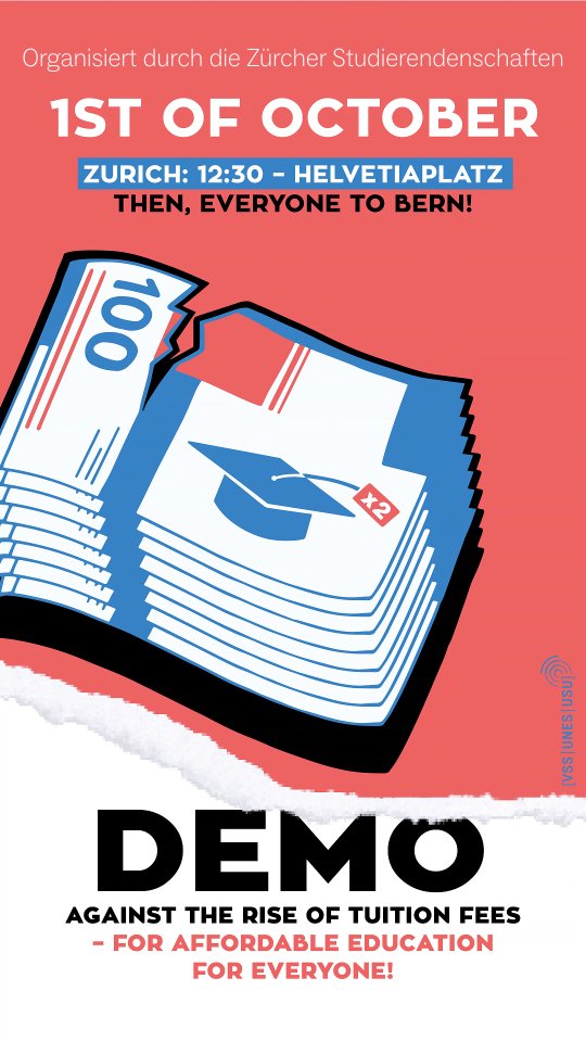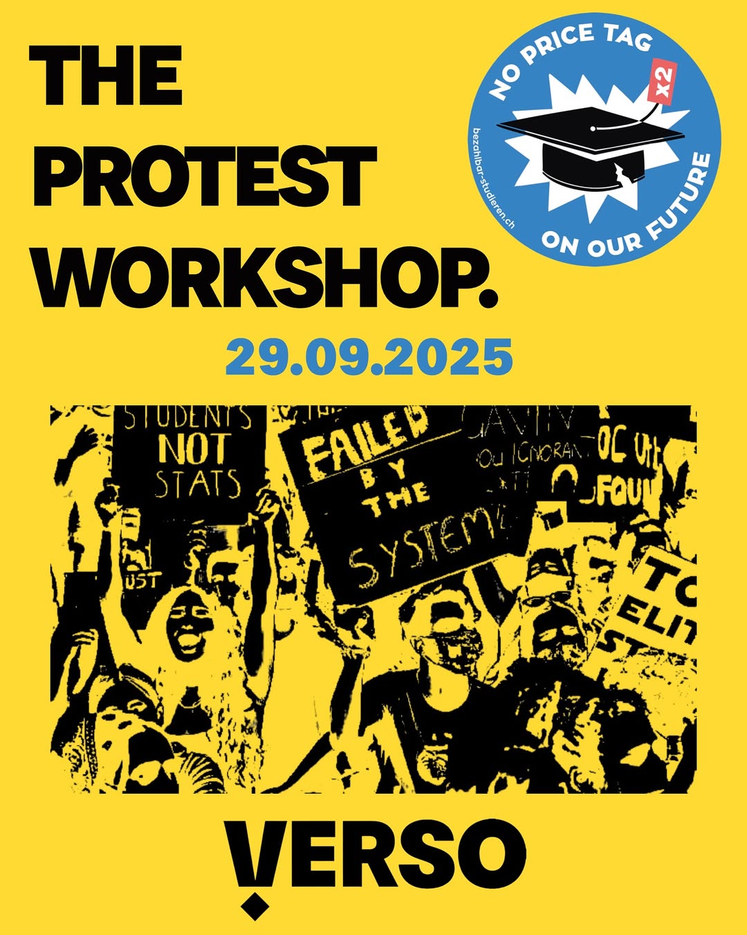 On October 1, 2025 at 12:30 p.m., a demonstration against the increase in tuition fees will take place at Helvetiaplatz/Ni-Una-Menos-Platz in Zurich. The national demo will take place in Bern. There is the possibility to go there with discounted tickets and continue the protest – more information on the demo website. To be well-prepared for the demo, VERSO DFA (Fine Arts) is holding a banner workshop on September 29.