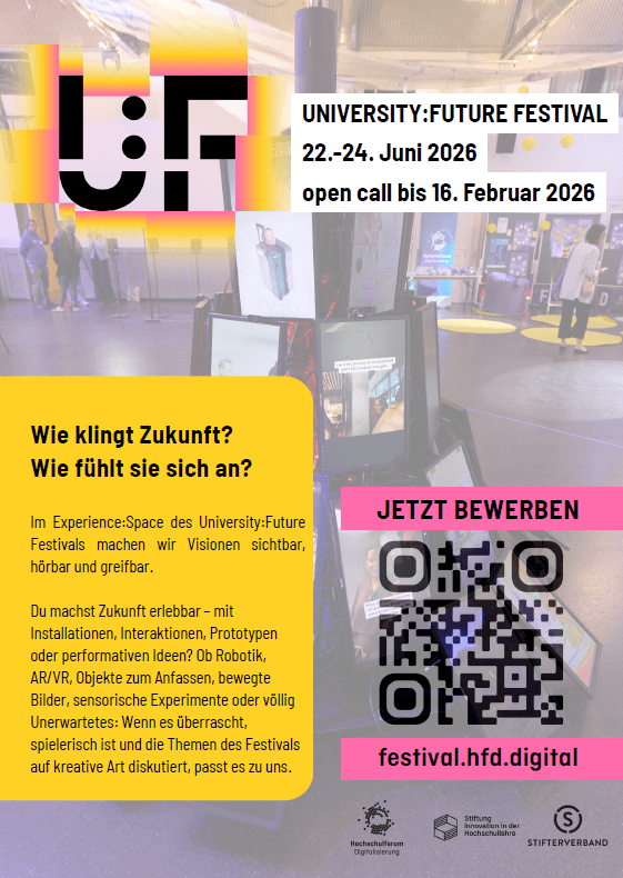 Gesucht werden Experimente, Installationen, Prototypen oder Interventionen für unsere Experience:Spaces. Die Beiträge sollen zeigen, wie digitale Transformation in der Hochschulbildung aussehen kann und die Themen des Festivals auf kreative Weise reflektieren. Ziel ist es, Festivalteilnehmende zum Staunen, Nachdenken und Diskutieren anzuregen. Alle Infos hier: https://festival.hfd.digital