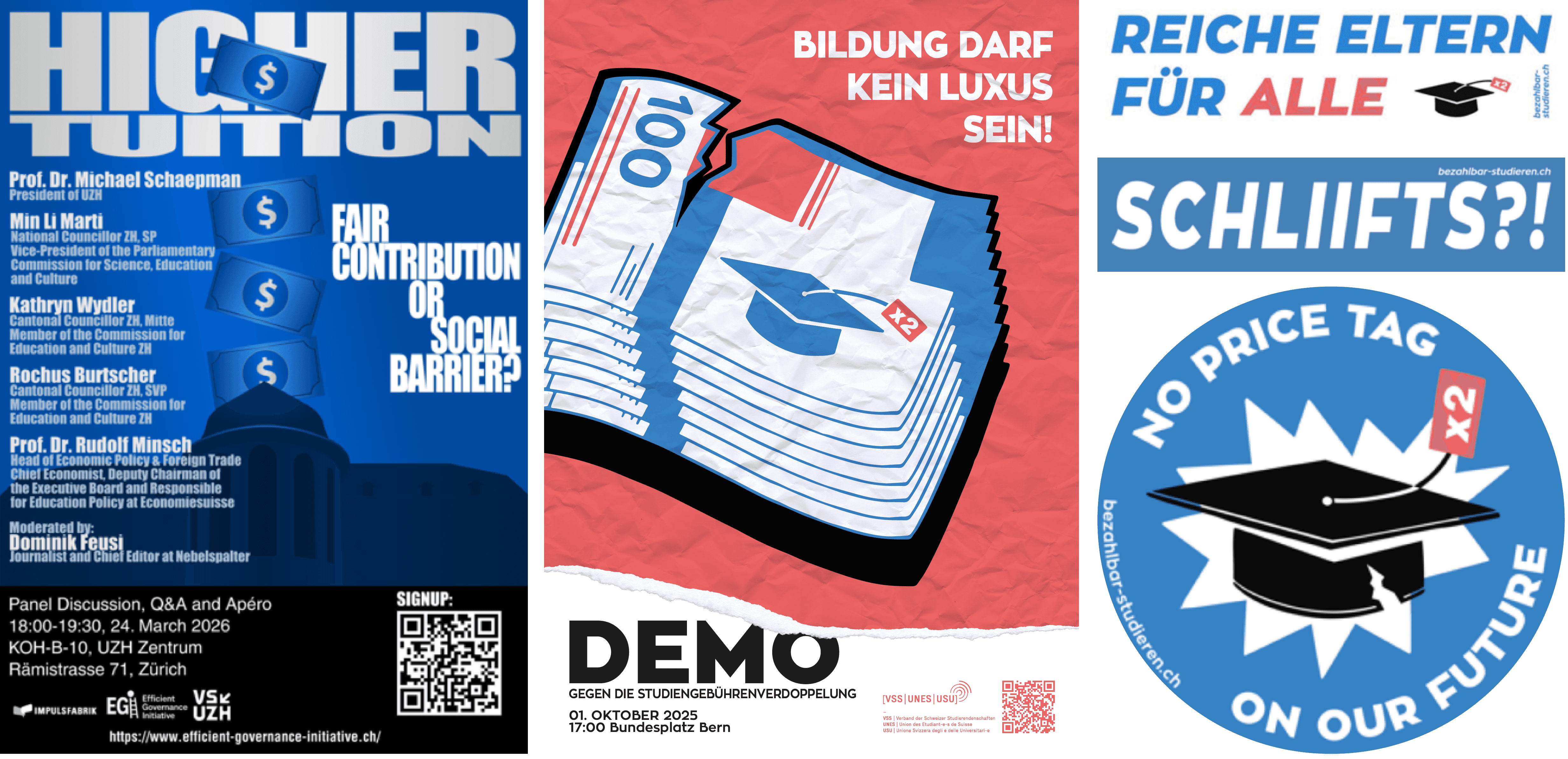 Im Verbund mit dem Verband der Schweizer Studierendenschaften (VSS)*** haben wir uns gegen eine Erhöhung der Studiengebühren stark gemacht. Am 1.Oktober 2025 fanden deswegen in Zürich und Bern Demonstrationen mit über 3000 Teilnehmenden statt und der VSS hat der Bundeskanzlei eine Petition mit 37'361 Unterschriften übergeben (vergleiche Artikel VSS). Kurz zuvor am 19. September 2025 hatte der Bundesrat das Sparpaket an das Parlament überwiesen. Am 24.02.2026 fand an der UZH ein Aktionstag gegen Austerität und Militarisierung statt und am 28.02.2026 eine zweite Demo in Zürich, organisiert von students united ZH. Zuletzt fand am 24.03.2026 eine Podiumsdiskussion mit dem Titel «Fair Contribution or Social Barrier?» an der UZH statt. Leider haben die Uni Bern und die Berner Fachhochschule bereits vor Abschluss der Diskussion der Sparmassnahmen im Bundeshaus massive Studiengebührenerhöhungen beschlossen.
